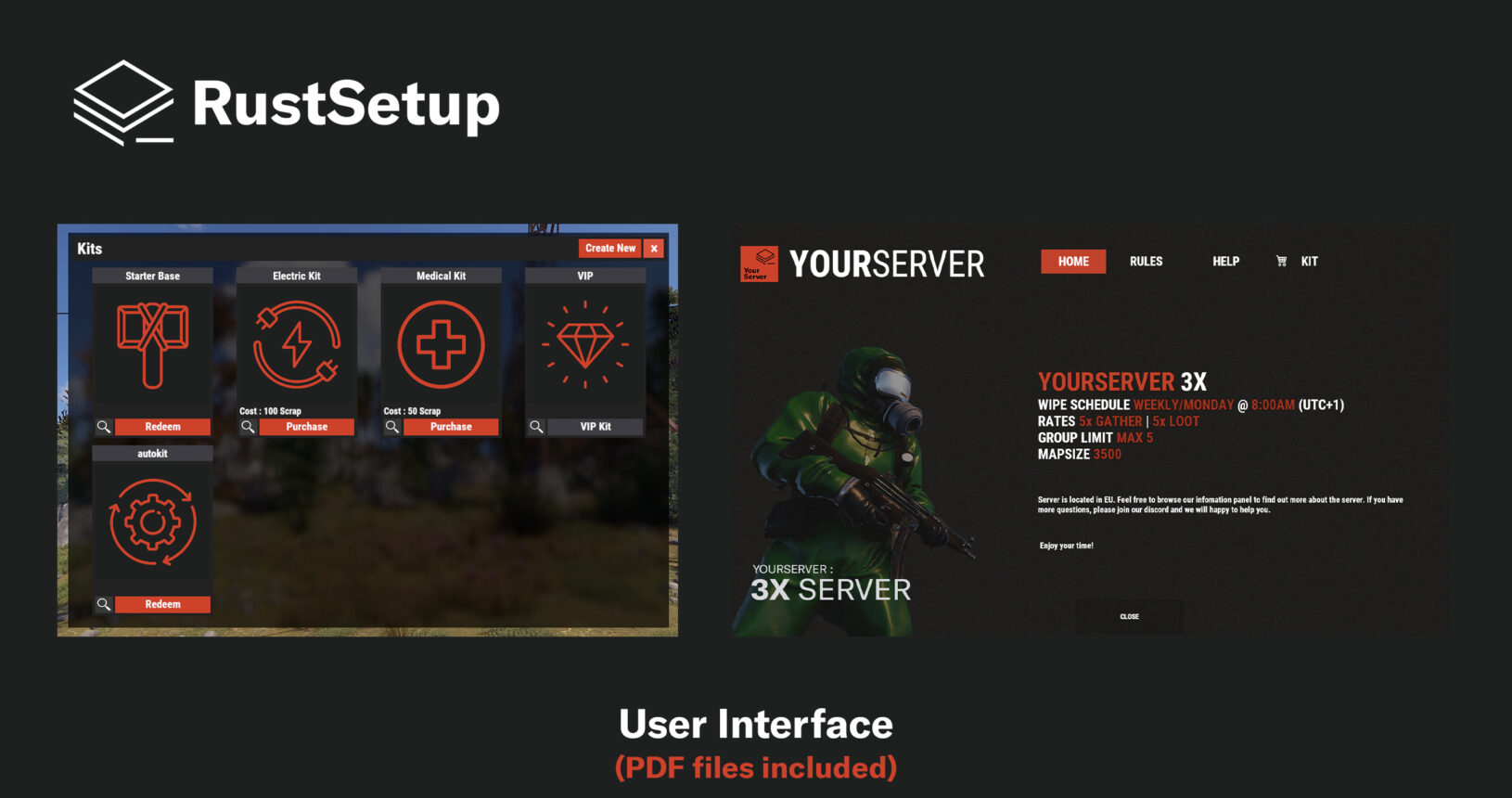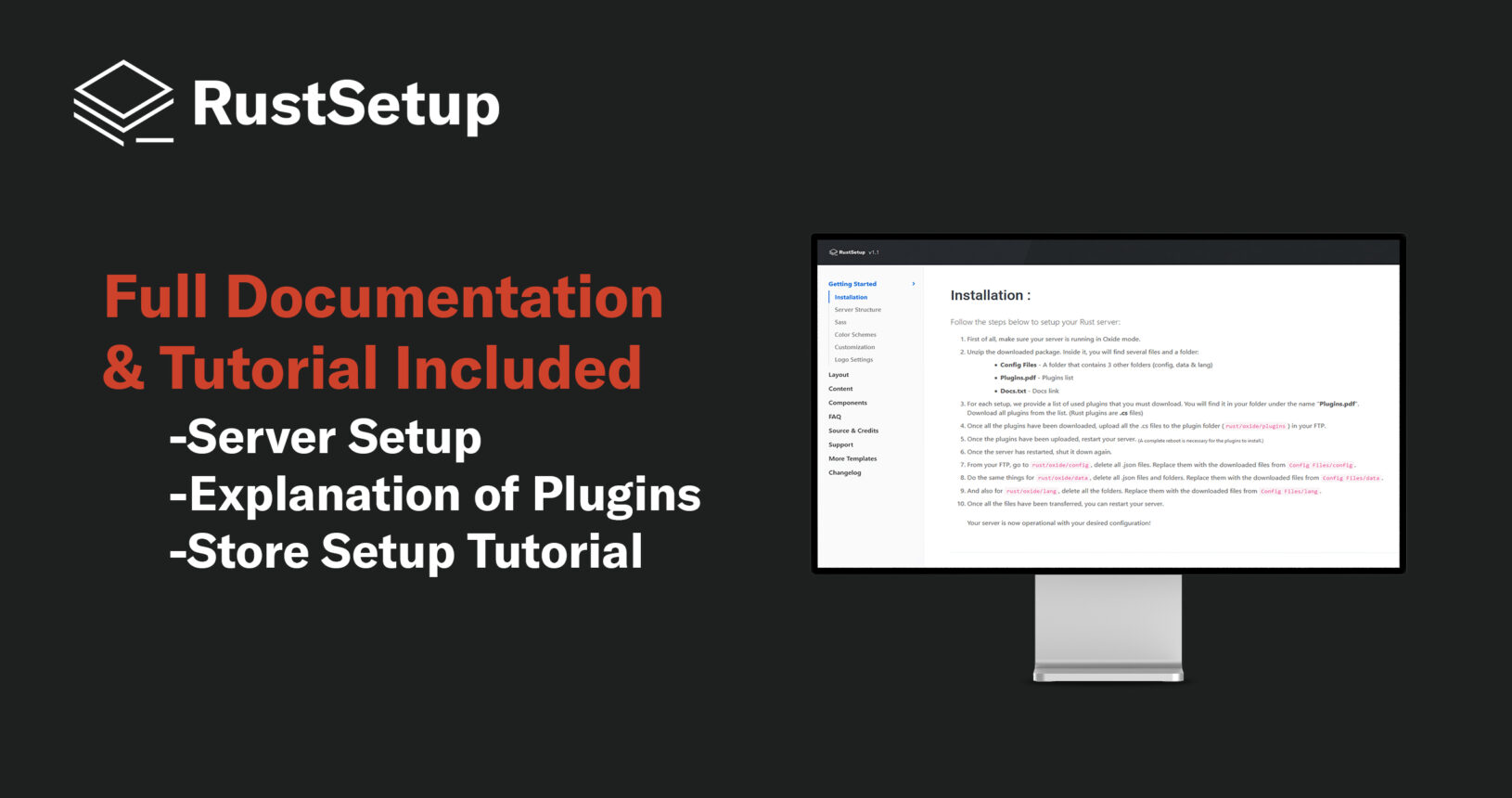 Documentation detailing the installation process is provided. It also includes explanations of the plugins as well as the steps to take if you wish to make changes. Perfect for your first Rust server.
